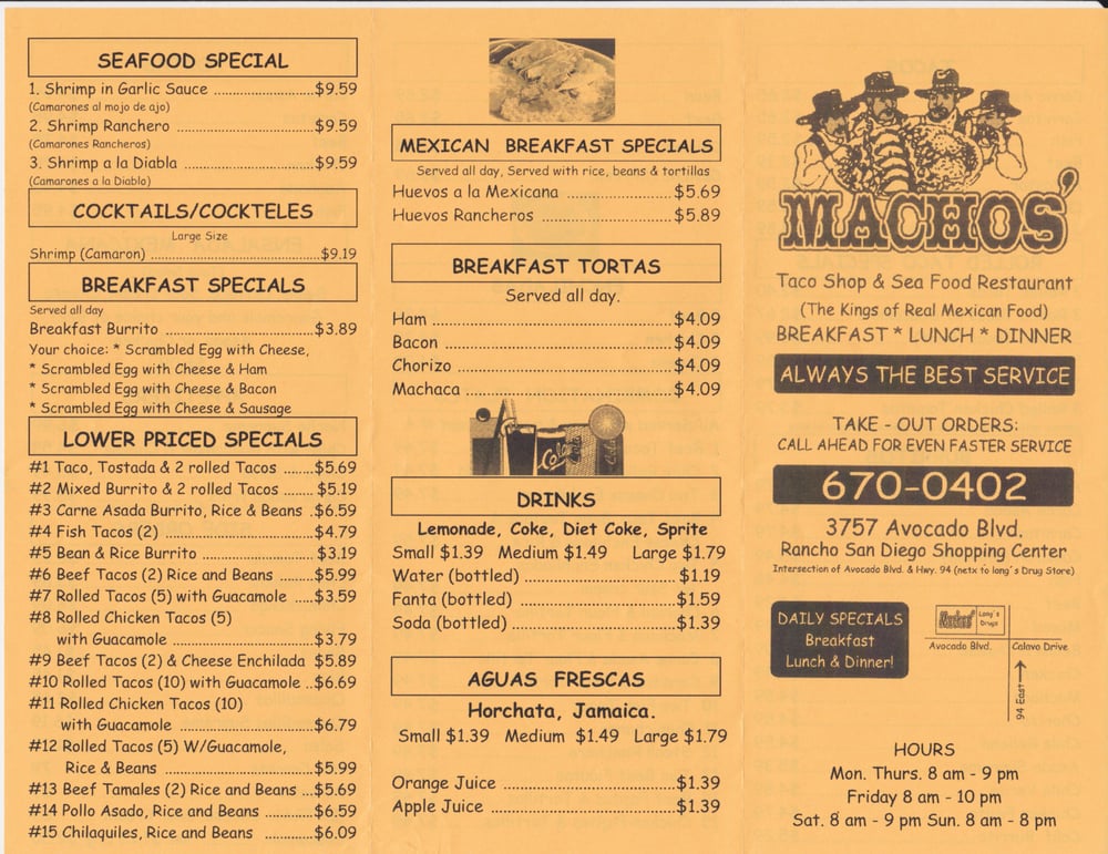 Introducing Macho's Taco Shop, a Mexican eatery located at 3757 Avocado Blvd in La Mesa, CA. This casual restaurant offers a variety of vegetarian options and accepts various payment methods, making it convenient for all customers. With options for delivery, takeout, and catering, Macho's Taco Shop caters to different dining needs. Customers rave about the flavorful food, quick service, and charming ambiance. Highlights include juicy enchiladas, a chip bar, and a salsa bar with exceptional flavors. The bean and cheese burrito stands out for its delicious combination, while the red salsa is a definite crowd-pleaser. Visit Macho's Taco Shop for a reliable and affordable Mexican dining experience that won't disappoint.